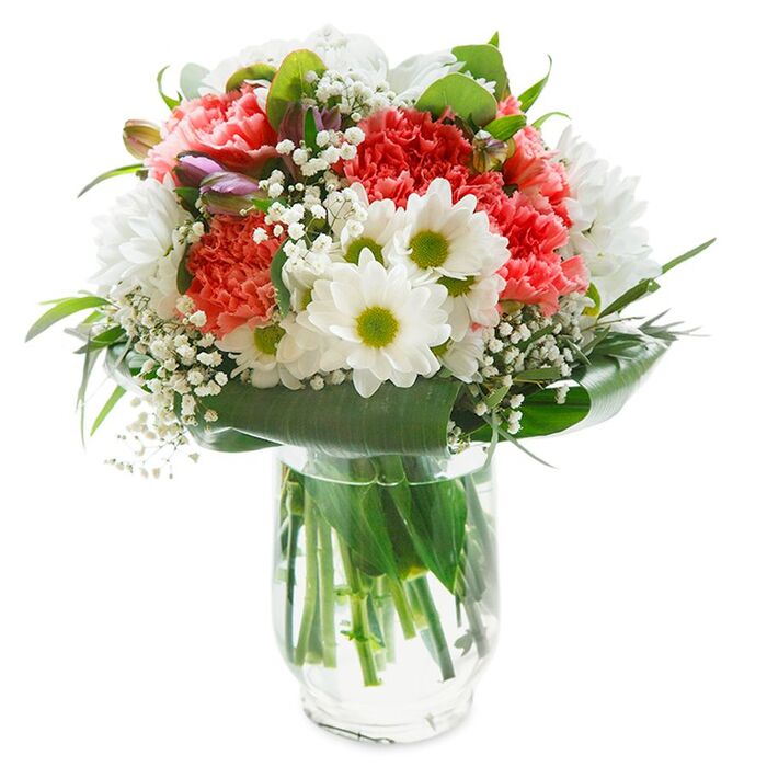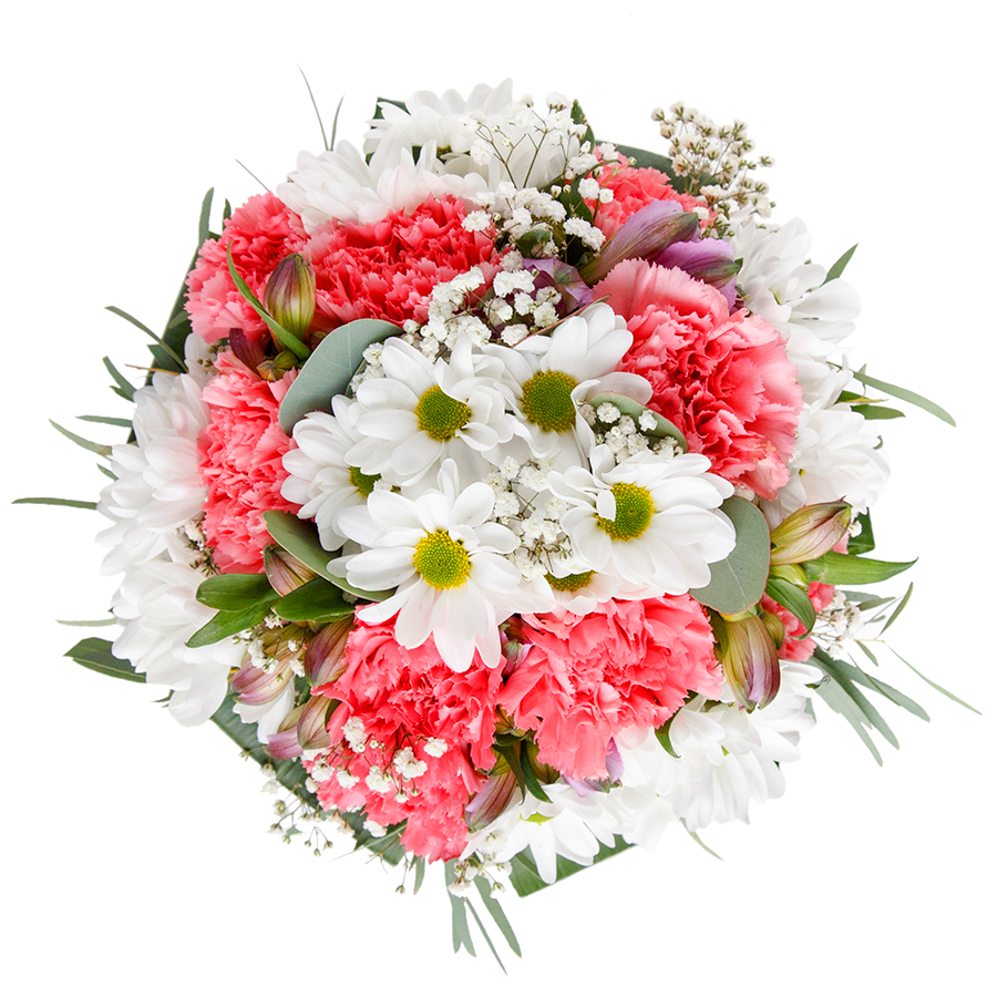 Bring tranquility and beauty into any space with our serene bouquet, artfully arranged to evoke joy and admiration. This stunning mix features pure white chrysanthemums, delicate gypsophila, and charming light pink carnations, intertwined with lush aspidistra leaves for a captivating display.